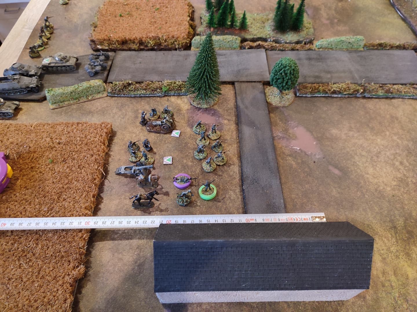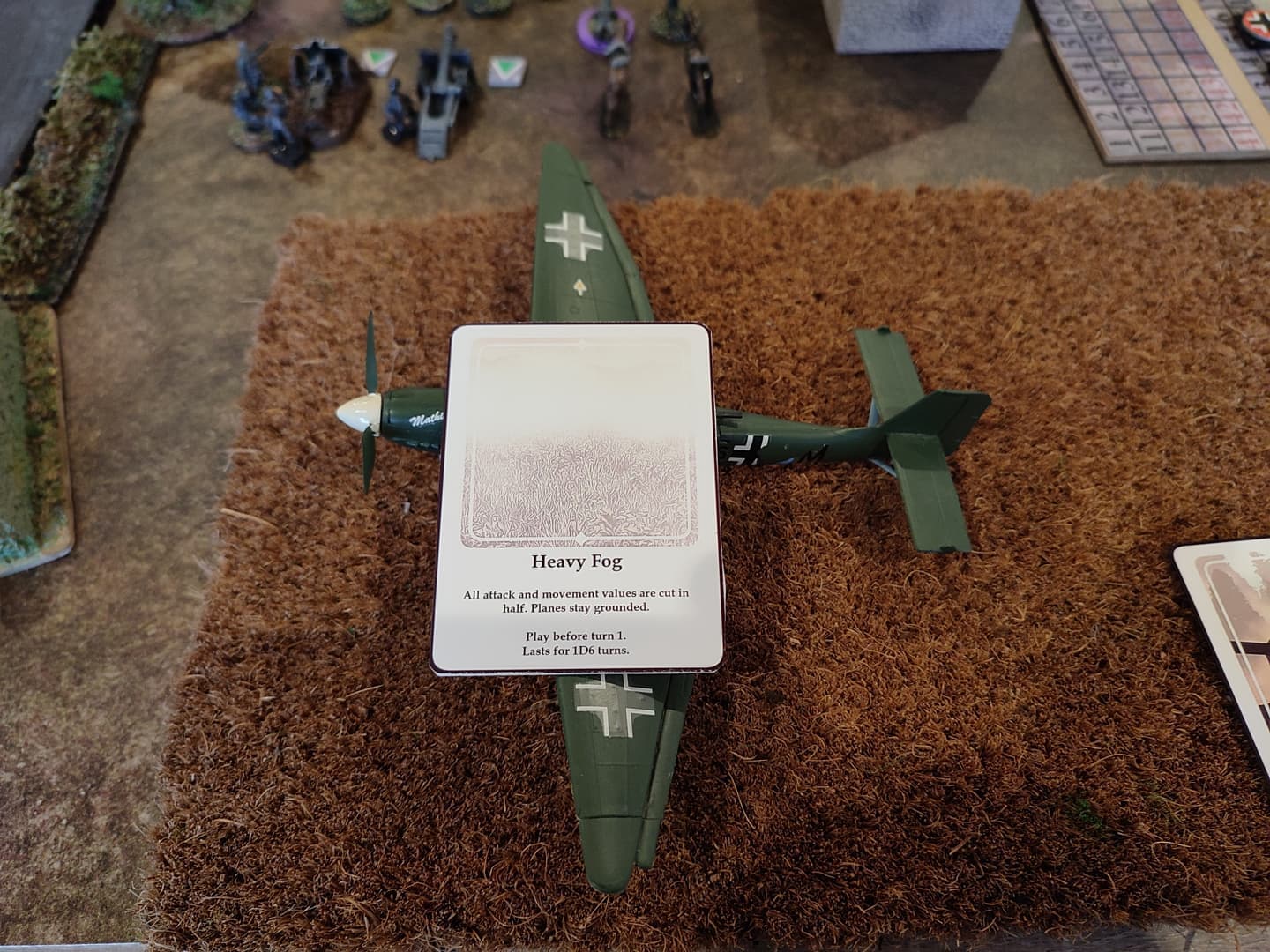 The Germans started the game on the wrong foot. My mate drew the card heavy fog and rolled a 6 in the D6. The roll determines the number of rounds the fog will last and games only lasts for five rounds. No airplanes may start in this kind of weather, also all movement by other troops is cut in half. As a consequence the Stuka dive bomber had to stay grounded for the whole game. Bad luck for the attacking forces. A Stuka is worth 25 points. Each of the four parties had a 100 points to spare. Bad luck it seemed. But the weather also made it nearly Impossible to hit and harm enemy units. An SdKfz 251, a damaged 222, a PIID, a motorcycle and one injured soldier on a horse rushed by the enemy’s hastily built defense line. The game ended in turn 3 with a decisive German victory.